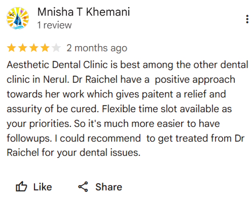 Aesthetic Avenue Dental Clinic, agjeevan CHSL, Plot No. 302/A, opp. Hawares Centurion Mall, Nerul East, Sector 21, Nerul, Navi Mumbai, Maharashtra 400706
