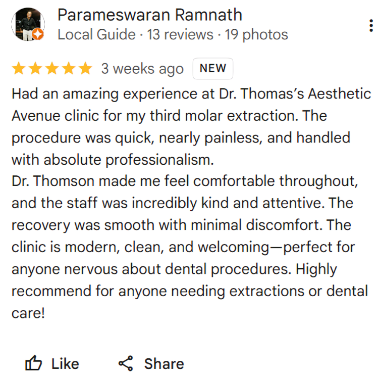We maintain a clean and safe environment in the clinic. All tools are properly cleaned, the staff wears protective gear, and we sanitise surfaces regularly. If youâre visiting a dentist near me and are concerned about hygiene, thatâs a valid and important question. We also give time between patients to clean everything properly. Patients often tell us they feel safe here just by how we manage cleanliness. We treat this as a non-negotiable part of care â not just something we say.